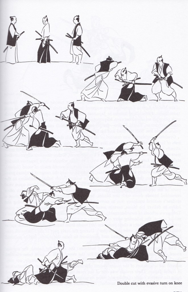 The ambush gets frustrated when four samurai, young and drunk, appear on the scene to provoke Takeshi, and he dispatches the three closest with a stroke from the scabbard (iai). Here we find the first scene that might challenge the limits of ability. Let’s see how it’s described: